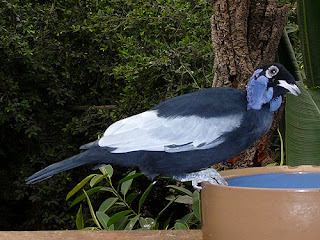 Mede cerca de 36 cm de comprimento. Tem os lados do pescoço nus e vivamente coloridos de azul, o que contrasta com a densa plumagem negra de seu corpo. Suas asas (azul) e cauda também são longas, mas a cabeça parece pequena em relação ao corpo. Já a fêmea é menor e possui a plumagem cor de ardósia.